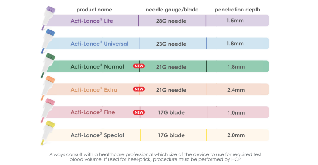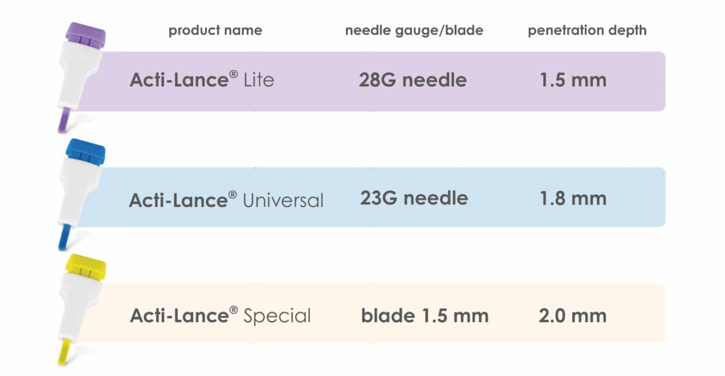 Acti-Lance safety lancets are available in three versions, each marked with a different color for easier identification: