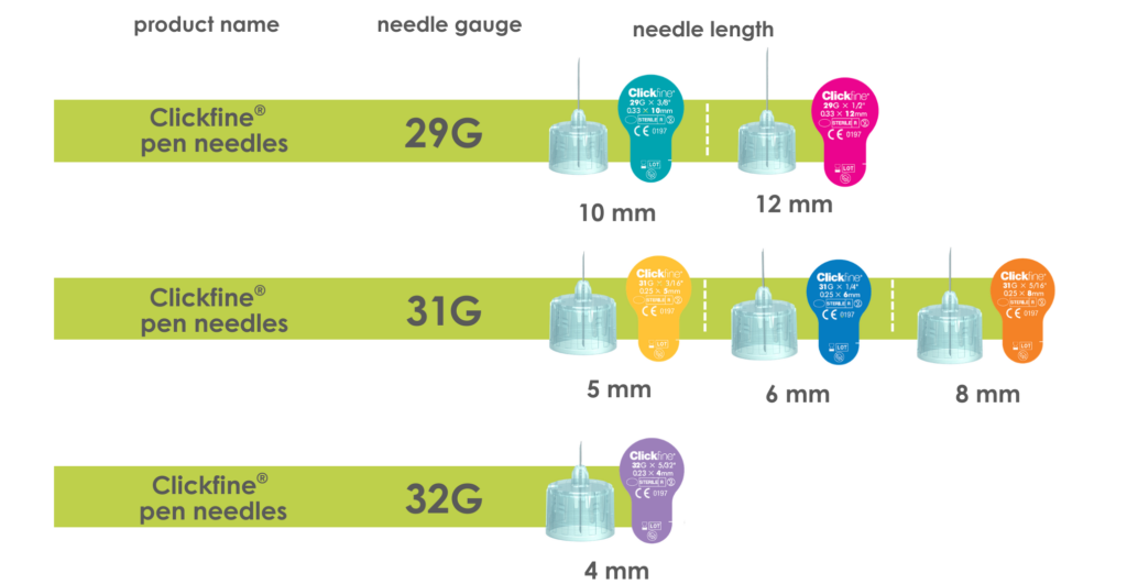 Clickfine pen needles are available in six versions, each marked with a different color for easier identification: