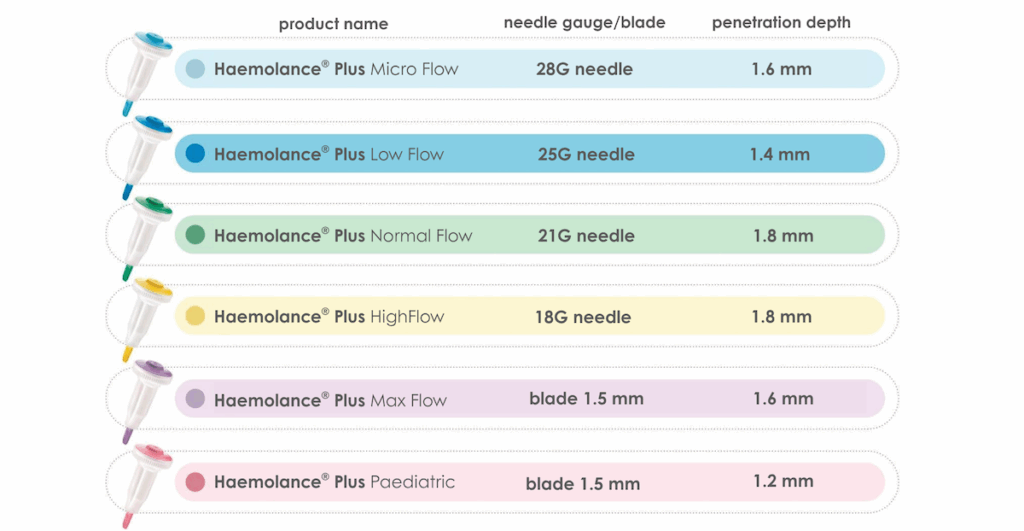 Haemolance Plus safety lancets are available in six versions, each marked with a different color for easier identification: