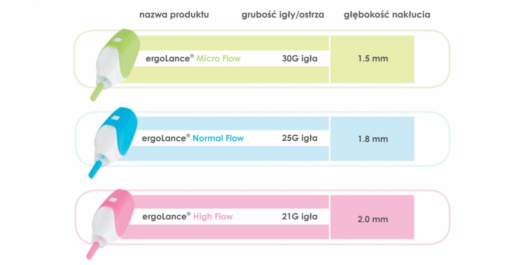 Lancety bezpieczne (nakłuwacze) ergoLance są dostępne w trzech wersjach, z których każdą oznaczono innym kolorem w celu łatwiejszej identyfikacji: