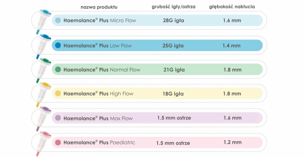 Lancety bezpieczne (nakłuwacze) Haemolance Plus są dostępne w sześciu wersjach, z których każdą oznaczono innym kolorem w celu łatwiejszej identyfikacji: